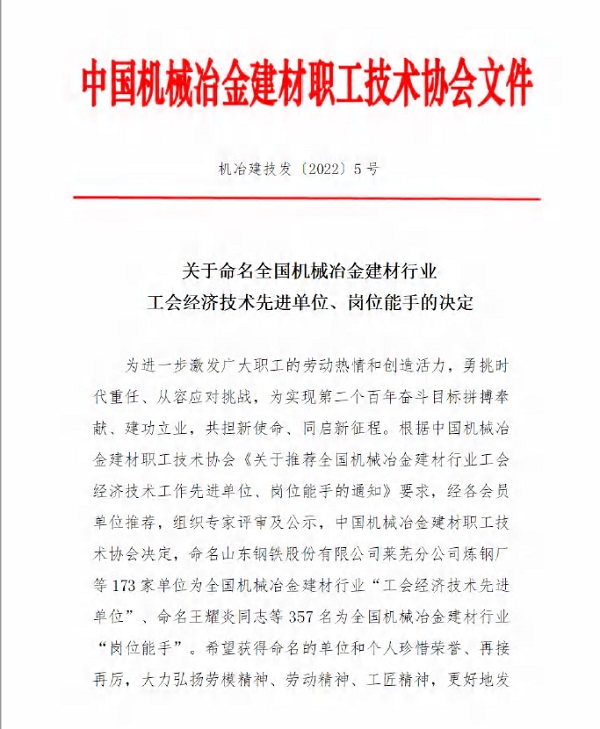 近日,中國機械冶金建材職工技(jì)術協會發布了《關於命(mìng)名全國機械冶金建(jiàn)材行業工會經濟技術先進(jìn)單位、崗位能手的決定》。其中,草莓视频在线看污(jīn)礦業工會委員會獲評“工會經濟技術先進單位”稱號。