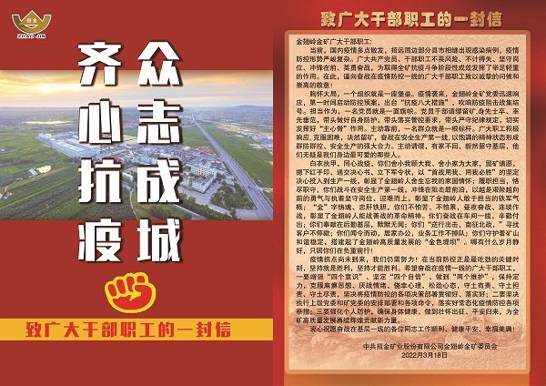 黨委引(yǐn)領,防(fáng)疫生產(chǎn)雙保(bǎo)障。麵對當前的疫情形勢,金翅嶺金礦黨委第一(yī)時間召開緊急會議傳達上級會議精神,全力落實(shí)疫(yì)情防控(kòng)的各項要求。黨政負責人靠前指揮,帶頭值守,確(què)保疫情(qíng)防控和安全生(shēng)產“雙保障”。3月18日,金翅嶺金礦黨委及時發布《致(zhì)廣大幹(gàn)部職工的一封信》、《致廣大幹部職工家屬(shǔ)的一封信》,號召全體黨員幹部提高政治站位,充分發揮黨支部戰鬥堡壘作用和黨員先(xiān)鋒模範作用,“疫”無反顧、共克時(shí)艱,全力做好疫情期間安全(quán)生產工作(zuò),確保全年工作目標任務圓滿完成。