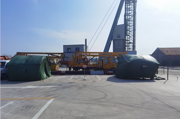 防疫安全有保障。為保證外來快遞文件接收點快速施工完成並兼顧實用性和耐用性,采用野戰帳篷(péng)作為快遞文件接收點。同時,配備消防沙、消防鍬、消防水桶及(jí)2具8KG水基滅火器,移動式紫外線消毒燈1個、床兩張、桌子一張、防疫消殺器(qì)具一組,並配備冷藏櫃方便易變質食品的冷藏保存。安裝高清監控攝像頭兩處(chù),同時安裝實時監控(kòng)係統並與礦山綜(zōng)合調度中心監控係統聯網。
