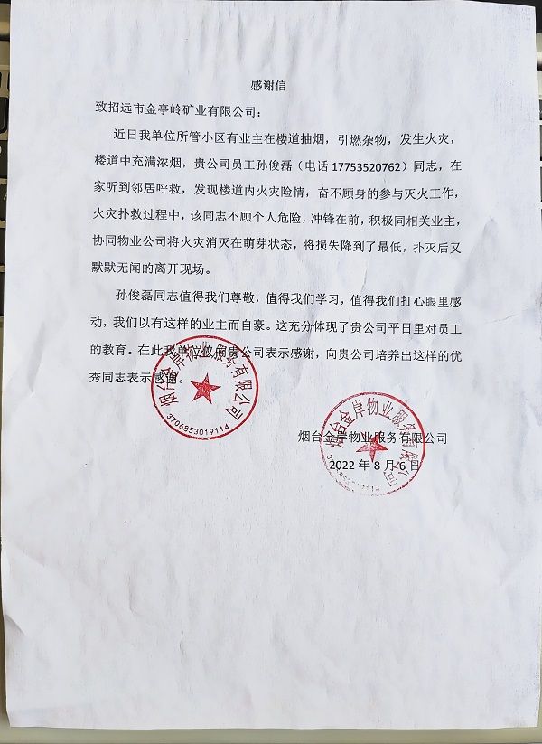 因為孫(sūn)俊磊對火情處置及時得當,火情在第一時間得到了有效控製,在最短時間內被撲滅(miè),各種(zhǒng)損失被降到了最低。事(shì)後,他守口如瓶,從未向同事(shì)及朋友提及(jí)此事(shì),若不是這封感謝信,他(tā)會一直“瞞”下去。他說(shuō):“我在礦上就兼職應急救護隊員,無論是在單位,還是在(zài)生活中,遇到這種情(qíng)況理應衝(chōng)鋒(fēng)在前。火(huǒ)警響起迎火而(ér)上,這是我(wǒ)義不容辭的(de)職責。”