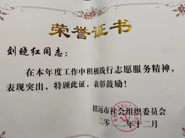 一(yī)顆(kē)愛心傳遞(dì)下去,必將燃成(chéng)星星之火,為更多的人(rén)照亮前行道路。劉(liú)曉紅以“行勝於言”的執著(zhe)帶動一雙(shuāng)兒女、親人和同事也加入了誌願者(zhě)的隊伍。四年時(shí)間裏,她參與誌願服務時長(zhǎng)累計820餘小時,連續多年被招遠市金太(tài)陽(yáng)誌願(yuàn)服務中心授予“優秀誌願者(zhě)”榮譽稱號;2022年,被招遠市社會組織委員會授予“優秀誌願者”榮譽稱號。