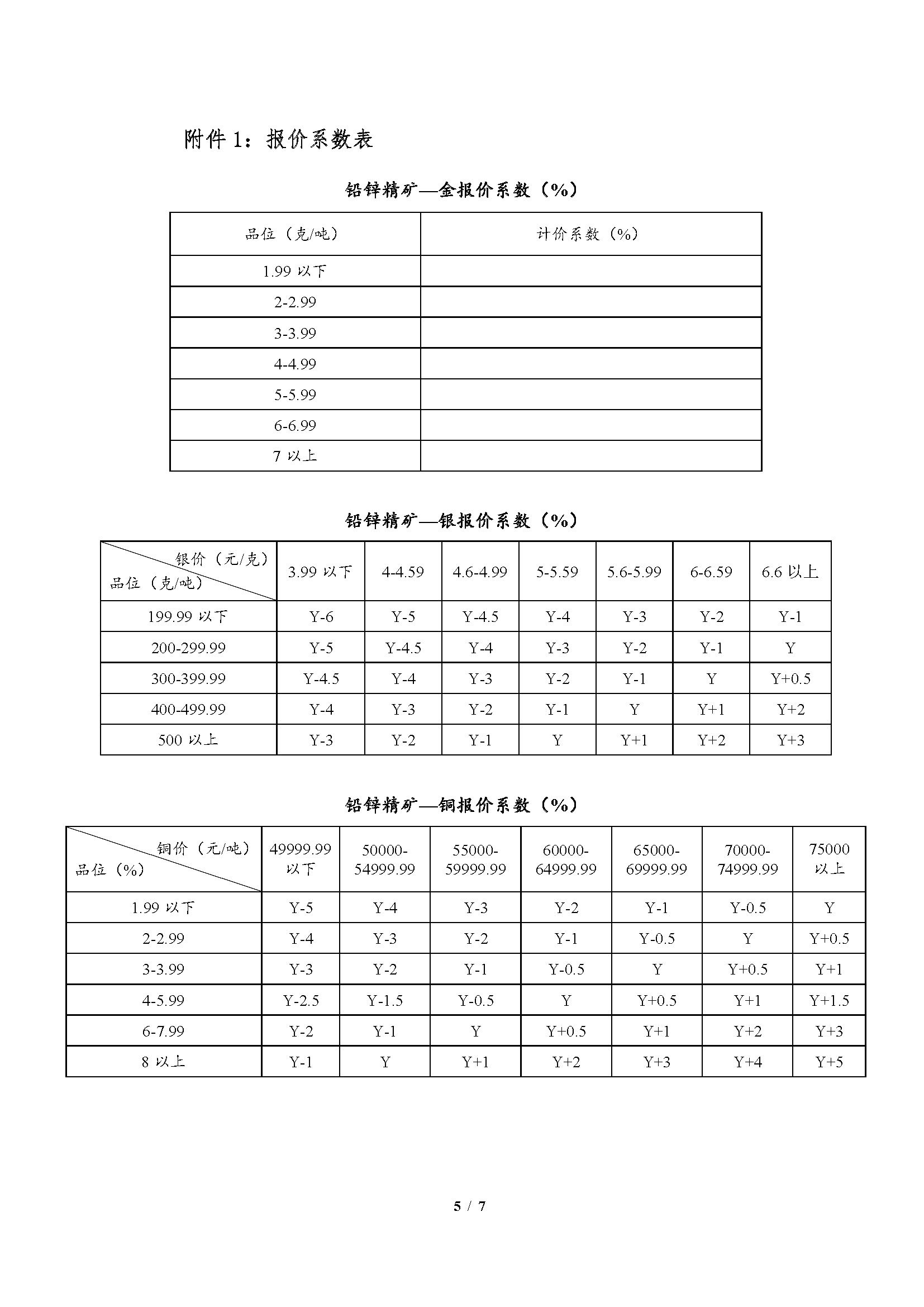 2.本次招標為一次性報價,在標書報送截止後(hòu)現場製定底標並在規定時間內進行開標(biāo)。本次招標以我單位檢測(cè)的(de)本批次礦各元素平均(jun1)品位(wèi)對應的報價係(xì)數測(cè)算出綜合單(dān)價,每幹噸礦計算的價值最高者得。