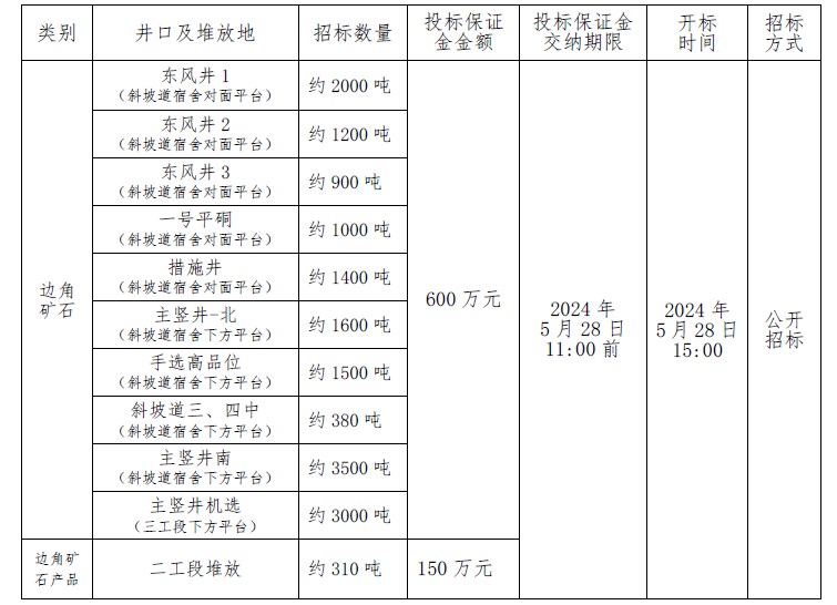 本次招標產品為我公司邊角礦石。投標人需提供“三證合(hé)一”的營業執照複印件、法人(rén)授權委托書(原件)並加蓋企業公章,於2024年5月27日 11: 00 前將上述材料送交(jiāo)甘(gān)肅省合作早子溝金礦有限責任公司人力資源法務人員進(jìn)行審核(hé),審核合格後的單位應於2024年5月28日11:00前交納投標保證金(見下表,保證金須(xū)以轉賬方式支付)。投標保證金交納金額與我公司招標文件要求不符的、投標保證金未及時到賬的視為廢標。若投(tóu)標人最終未中標,則由投標人開具收款收據後,我公司將一次性無息退還投標保證金(jīn)。