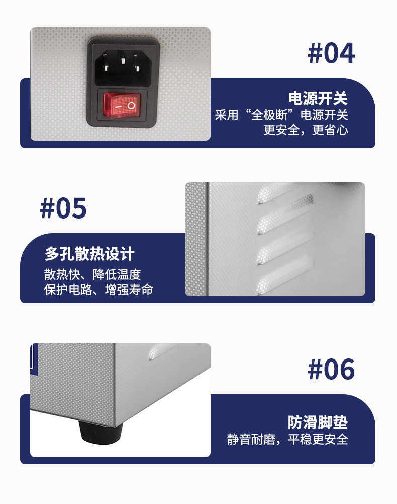 四位定時可調,時(shí)間控製精確(què)到秒(miǎo),1-99分鍾可調可根(gēn)據清洗(xǐ)需求進行調節。純銅線機芯,高(gāo)溫不燒(shāo)機大功率工業級震(zhèn)動芯片,空(kōng)化效應強度高打釘+烤膠雙重固定/性能(néng)穩定壽命長。SUS304不鏽鋼,一次性衝壓成型。